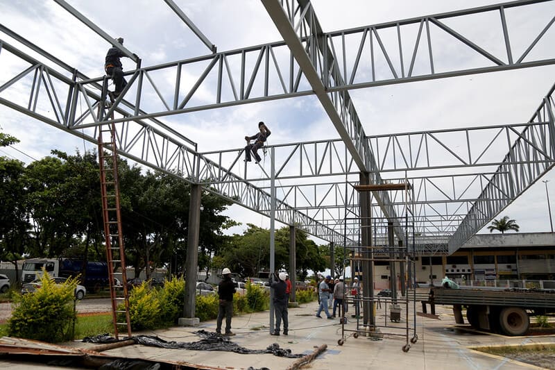 As obras da rodoviária Shopping Estrada avançam na substituição da estrutura metálica do Terminal 1. Com cerca de três meses de trabalho, os operários já removeram a estrutura antiga e finalizam a instalação da nova para a fixação da telha de cobertura, o que deve ocorrer nas próximas semanas. Com investimento total de R$ 7.518.106,07, o prazo de execução total da reforma é de 10 meses. Ainda de acordo com Thiago, a reforma transformará o cartão de visita da cidade. “O prefeito Wladimir Garotinho, com toda a sua sensibilidade, entendeu que um cartão de visita na entrada da nossa cidade não poderia ficar mais desse jeito. E aí a gente começa essa obra tão importante pela quantidade de usuários não só do nosso município, mas de todo o Estado e também do Brasil, porque nós temos aqui à frente desse terminal rodoviário, a BR-101. Então a obra é muito importante, muito esperada e muito necessária”, comentou. O projeto prevê a reforma geral para revitalização do espaço, com obras que vão reestruturar e modernizar as instalações do terminal interestadual de ônibus, que, inclusive, terá nova fachada. Vão ser reformados os banheiros, fraldário, as instalações hidráulicas, elétricas, de esgoto e o sistema de iluminação, além da ampliação da estrutura metálica e da cobertura e ainda a reforma das vias de acesso do estacionamento e do pátio de manobra dos ônibus.