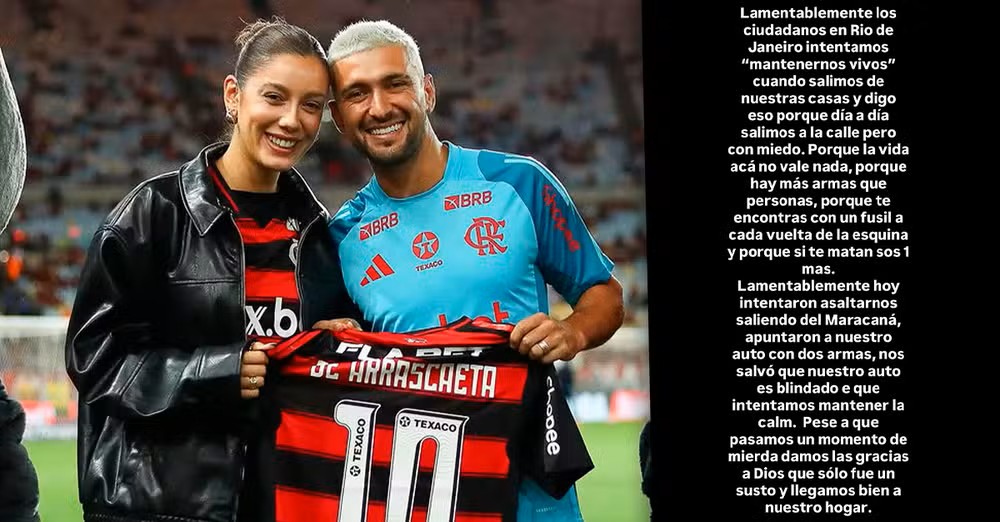 Giorgian de Arrascaeta, jogador do Flamengo, disse na noite do último domingo (19) em sua conta no X que após o jogo do clube carioca contra o Palmeiras pelo Campeonato Brasileiro, ele e sua família sofreram uma tentativa de assalto à mão armada na saída do Maracanã. Em espanhol, escreveu: "Infelizmente nós cidadãos do Rio de Janeiro tentamos 'manter-nos vivos' quando saímos de nossas casas e digo isso porque todos os dias saímos para a rua, mas com medo. Porque a vida aqui não vale nada, porque há mais armas do que pessoas, porque você encontra uma espingarda em cada esquina e porque se você for morto você é mais um". Camila está grávida do primeiro filho com o jogador, com quem se relaciona desde 2013 e trocaram as alianças em uma cerimônia em 2023. — GiorgiandeArrascaeta (@GiorgiandeA) October 19, 2025