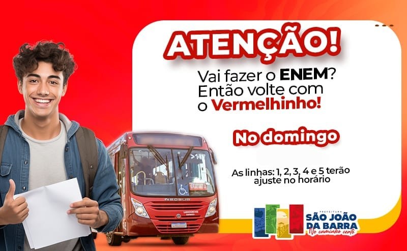 A segunda etapa do Exame Nacional do Ensino Médio (Enem) 2025, neste domingo, 16, contará também com um esquema especial no transporte público gratuito de São João da Barra para o retorno dos alunos que farão as provas no Colégio Estadual Alberto Torres, no Centro da cidade. A Secretaria Municipal de Transporte e Trânsito manteve o planejamento aplicado no domingo passado, 9, com o “Vermelhinho” saindo da Rodoviária, às 19h15, para as seis linhas que atendem a todos os distritos. “Acompanhamos, junto à empresa que atua no setor, como funcionou o esquema que organizamos a pedido dos estudantes para o primeiro dia de prova e foi tudo certo. Para esta segunda etapa, decidimos seguir as mesmas mudanças para que os alunos possam fazer suas avaliações com tranquilidade”, disse o secretário municipal de Transporte e Trânsito, Renato Timotheo. Terá, mais uma vez, o reforço na linha 5, com o horário de 19h15 criado excepcionalmente para este domingo atendendo o itinerário que parte de SJB para o Açu (Quixaba via Pipeiras). Enquanto isso, na linha 6 (Açu via Campo de Areia/Pipeiras), o ônibus que geralmente é 19h na Rodoviária, sairá neste domingo 15 minutos depois.