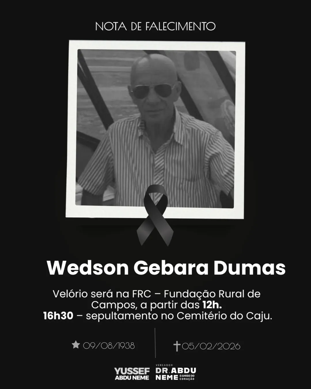 Faleceu Wedson Gebara Dumas, conhecido carinhosamente como Edinho, figura muito querida por familiares, amigos e pela comunidade ligada ao setor agropecuário do município. A informação foi divulgada nas redes sociais pelo vereador e médico Abdu Neme, genro de Edinho, que prestou uma homenagem emocionada. O velório terá início entre 12h e 13h, na Fundação Rural de Campos (FRC). O sepultamento está marcado para as 16h30, no Cemitério do Caju.