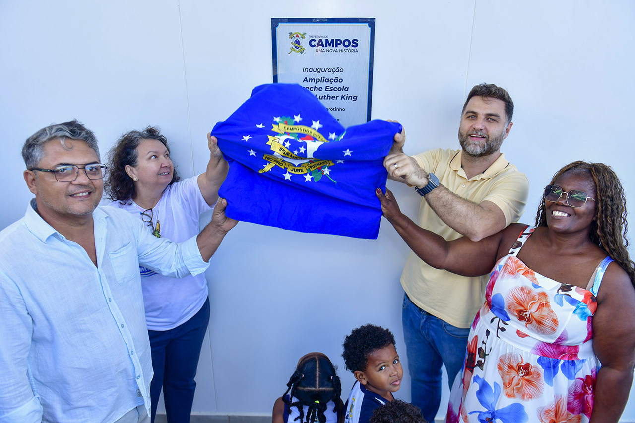 O prefeito Wladimir Garotinho inaugurou, nesta quinta-feira (23), a ampliação da Creche Escola Martin Luther King, no Parque Novo Eldorado. A cerimônia de entrega foi feita pelo prefeito Wladimir Garotinho; o secretário da Casa Civil, Suledil Bernardino; e a secretária de Educação, Ciência e Tecnologia, Tânia Alberto. A Creche atende, atualmente, cerca de 160 alunos. A nova construção vai abrir mais cerca de 50 vagas, beneficiando, também, crianças dos bairros Santa Rosa, Terra Prometida, Custodópolis e Codin. O vereador Juninho Jubiraca (PP) prestigiou a inauguração. Durante a inauguração, o prefeito afirmou que será construída uma nova creche no São Silvestre, cujo terreno já está em fase de aquisição. “Ao todo, com essas novas ampliações, estamos abrindo 3 mil vagas a mais para os pais trabalharem e deixarem seus filhos em um lugar seguro. Só tenho a agradecer pelo trabalho de cada um de vocês dessa creche. Parabéns a toda a equipe e principalmente à diretora Priscila, que tem feito um excelente trabalho. As novas turmas que foram abertas vão atender as crianças do pré-1, para que elas não precisem mais ir para outros bairros, assegurando ainda mais a proteção na primeira infância”, informou. A secretária Tânia reconheceu o trabalho do prefeito e da diretora. “Estou ao lado de duas pessoas que representam muito para a sociedade. De um lado uma mulher negra ocupando um lugar de destaque na educação, como diretora desta creche, num país extremamente preconceituoso e que não admite que faz racismo e pratica isso todo dia. E do outro lado, um homem branco que reconhece esse tipo de preocupação e vota uma lei de cotas para que a gente coloque mais profissionais negros da educação. Essas duas pessoas aqui representam o que tem de mais importante no papel de qualquer educação popular, que é a educação que inclui a criança, filha desta comunidade que é eminentemente parda e negra, e que coloca diretores e professores negros para exercerem o seu trabalho". E a gente tem um prefeito que reconhece que essa é uma dívida histórica que essa cidade tem com seu povo e entende que a gente precisa fazer reparação histórica todo dia, porque se não fosse assim, a gente não estaria hoje lutando para colocar escola nova em lugar de casa alugada. É uma luta invisível que a educação pratica todo dia para que meninos e meninas negros possam ter o mesmo direito que meninos e meninas brancos. Só com educação a gente transforma a sociedade de verdade. E a Prefeitura de Campos tem feito a diferença com uma educação que inclui de verdade, não apenas no discurso”, acrescentou Tânia.